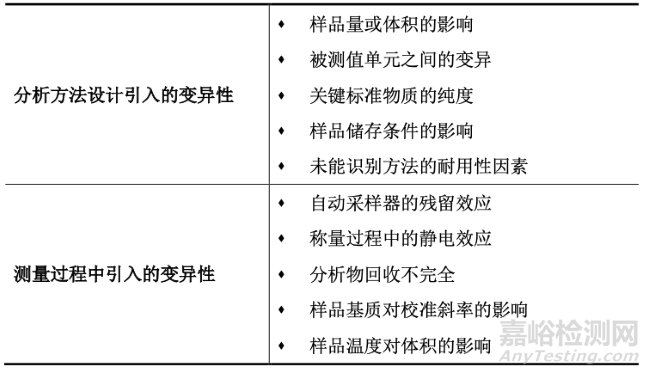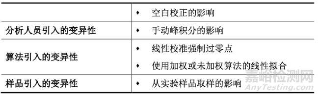 分析過程中不確定度的引入導(dǎo)致了誤差。下述表中展示哪些分析過程會引入這些不確性,從而導(dǎo)致誤差。