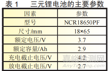 實驗材料為三元鋰電池18650PF,標稱容量2.9Ah,標稱電壓3.7V。該圓柱形電池的正極材料為鎳鈷錳(三元材料),其他參數(shù)如表1所示。