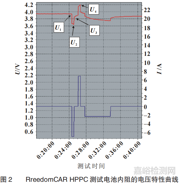 (1)將三元鋰電池置于溫控箱,溫度設(shè)為25℃,濕度30%,靜置1h以2.3A電流進行充放電,記錄充入容量C;(2)以1C倍率恒流放電至放電容量為0.01C時停止放電,此時電池SOC=0.9,靜置1h,電壓記為U1;(3)采用XC倍率大小的脈沖電流對電池進行恒流放電,持續(xù)30s,電壓記為U2,靜置60s,電壓記為U3;(4)采用XC倍率大小的脈沖電流對電池進行恒流充電,持續(xù)30s,電壓記為U4,靜置60s;(5)重復(fù)步驟(2)~(4),直至SOC=0.1;(6)調(diào)節(jié)脈沖電流倍率大小X為 2、3、4,重復(fù)(1)~(5),進行不同脈沖電流下的內(nèi)阻測試。