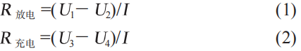 步驟(3)和(4)中,數(shù)據(jù)為0.1s采集一次。以放電過程為例,電壓變化曲線如圖2所示。在加載脈沖電流放電的瞬間,電池端電壓會產(chǎn)生階躍,接著相對緩慢變化,參考IEC內(nèi)阻測試方法,計算公式為: