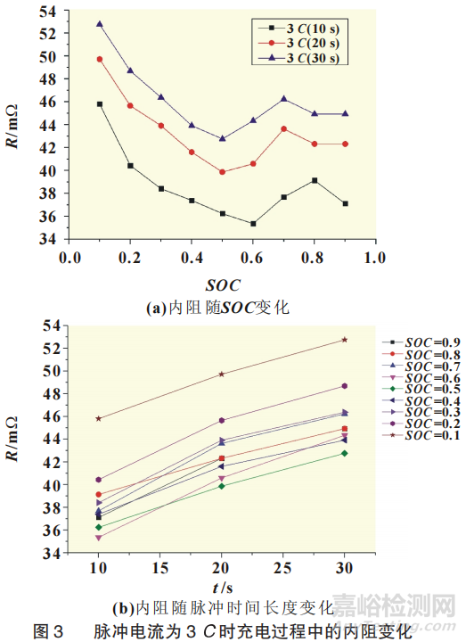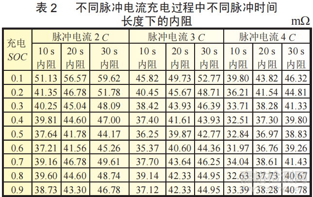 表2、表3為不同脈沖電流和不同脈沖時間長度對應(yīng)下充放電過程的內(nèi)阻測試結(jié)果。圖3為脈沖電流3C時,充電和放電過程中不同脈沖時間長度下內(nèi)阻隨的變化規(guī)律。