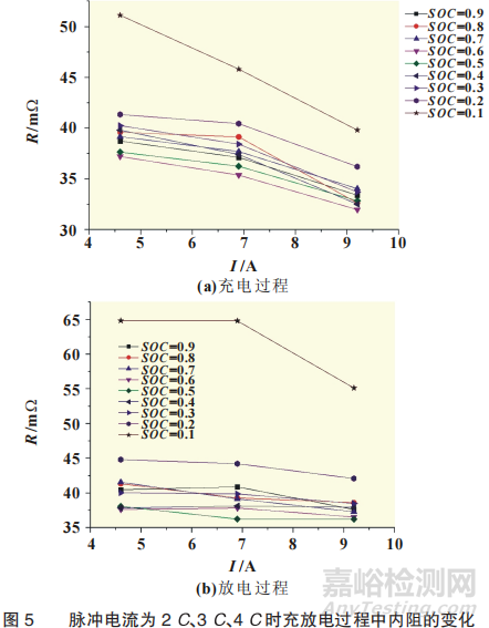 (3) 充、放電過程中,隨著脈沖電流值的增大,內(nèi)阻值近似認為以線性規(guī)律減??;SOC=0.1 和SOC=0.2時的內(nèi)阻值高于SOC=0.3到SOC=0.9的R值。充電過程中SOC=0.1時的最大值為59.62mΩ,放電過程中SOC=0.1時的最大R值為80.07mΩ。
