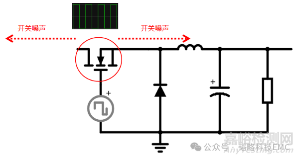 當(dāng)電路中的MOS開關(guān)管動作時,PWM方波的高次諧波噪聲就能通過輸入輸出走線向外傳導(dǎo),如下圖: