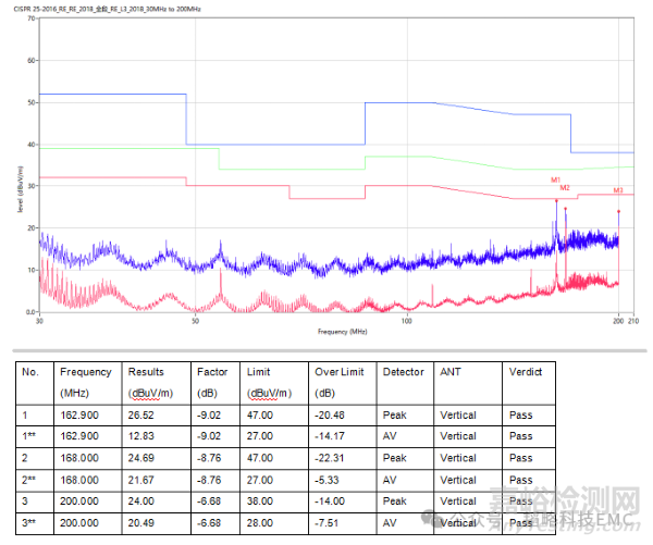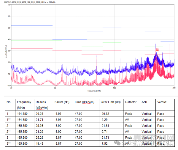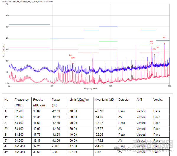 從上圖可以看出,由于磁珠的存在,當(dāng)有瞬態(tài)電流流過時,會有V=Ldi/dt,電壓波形出現(xiàn)了波動。(如果實測波形有測到過沖的出現(xiàn),可以考慮在這里增加RC電路作吸收。)我們來看下實際輻射測試數(shù)據(jù):