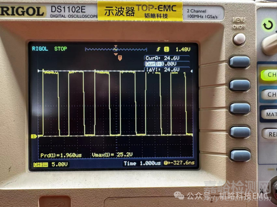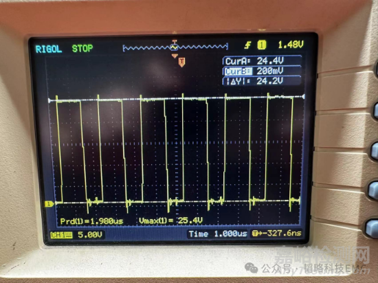 接下來用示波器抓取SW引腳的波形,看是否存在過沖現(xiàn)象,有過沖的話意味著存在較大的dv/dt,實際抓取波形如下: