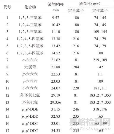表1 有機(jī)氯農(nóng)藥和氯苯類化合物質(zhì)譜參數(shù)