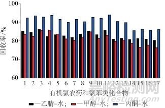 圖1 不同提取溶劑下有機(jī)氯農(nóng)藥和氯苯類化合物回收率