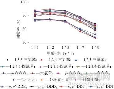 圖2 不同丙酮-水體積比下有機(jī)氯農(nóng)藥和氯苯類化合物的回收率