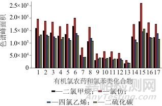 圖6 使用不同分散劑時(shí)有機(jī)氯農(nóng)藥和氯苯類化合物的色譜峰面積
