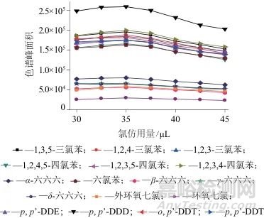 分別使用30.0、32.5、35.0、37.5、40.0、42.5、45.0 μL氯仿作為萃取溶劑,考察氯仿用量對17種有機(jī)氯農(nóng)藥和氯苯類化合物測定結(jié)果的影響,結(jié)果見圖5。