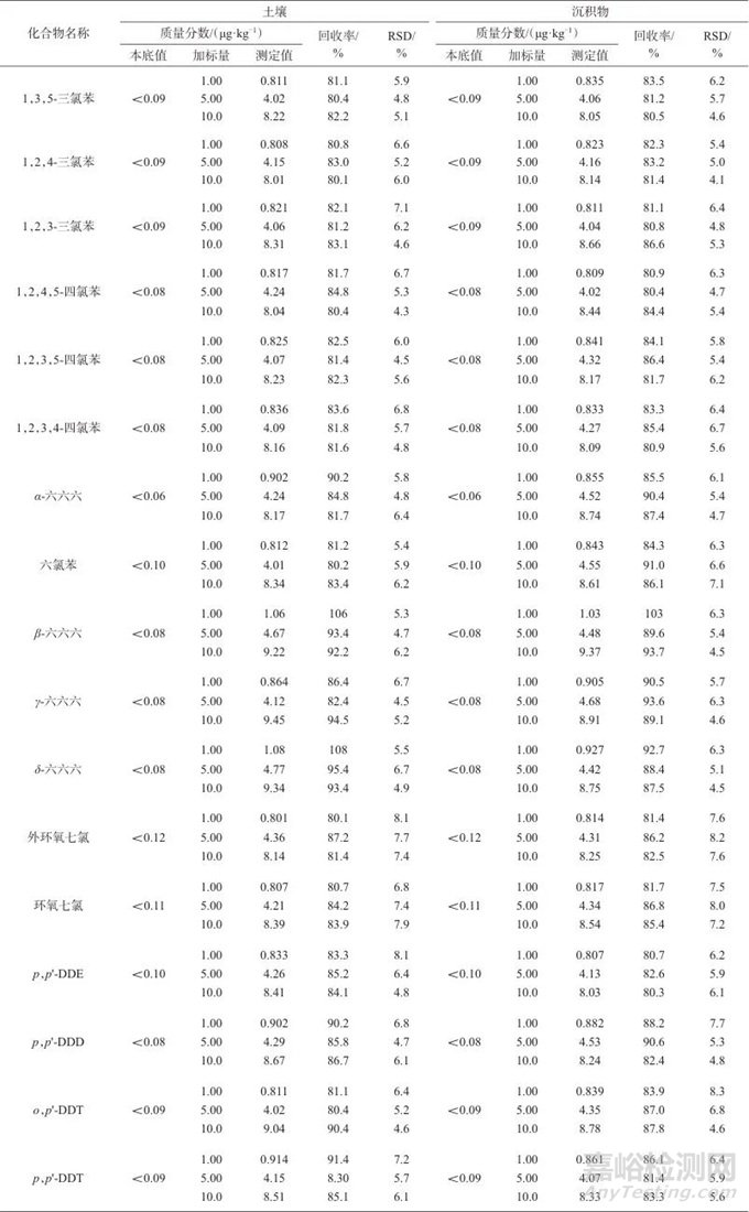 由表2可知,17種有機(jī)氯農(nóng)藥和氯苯類化合物的質(zhì)量濃度在0.05~10.0 mg/L范圍內(nèi)與色譜峰面積具有良好的線性,線性相關(guān)系數(shù)均大于0.999,方法的檢出限為0.06~0.12 μg/kg,定量限為0.24~0.48 μg/kg。