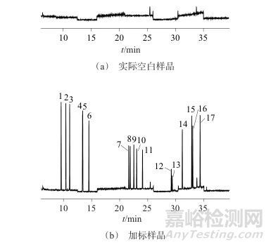 圖11 實(shí)際空白樣品及加標(biāo)樣品色譜圖
