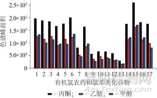 圖4 不同萃取溶劑時(shí)有機(jī)氯農(nóng)藥和氯苯類化合物的色譜峰面積