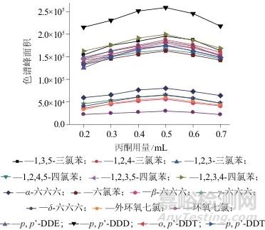 圖7 不同丙酮用量時(shí)有機(jī)氯農(nóng)藥和氯苯類化合物的色譜峰面積