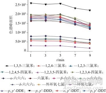 圖8 不同超聲時(shí)間下17種有機(jī)氯農(nóng)藥和氯苯類化合物的色譜峰面積