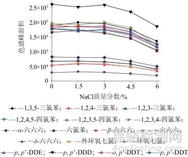 圖9 不同NaCl濃度時(shí)有機(jī)氯農(nóng)藥和氯苯類化合物的色譜峰面積