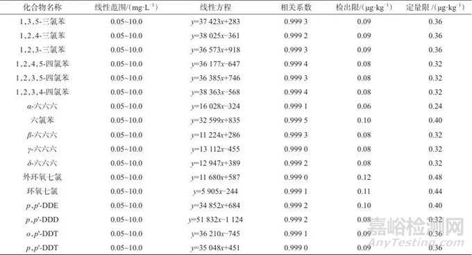 表2 17種有機(jī)氯農(nóng)藥和氯苯類化合物的線性方程、相關(guān)系數(shù)、方法檢出限及定量限