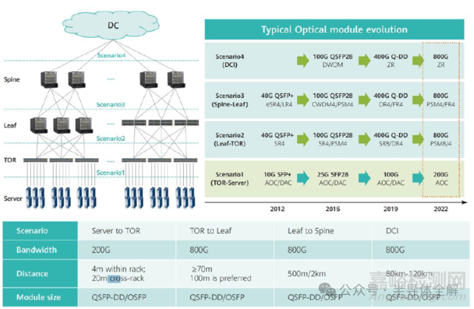 根據(jù)數(shù)據(jù)中心的架構(gòu)不同,不同節(jié)點(diǎn)間的傳輸距離和速率要求也不相同。