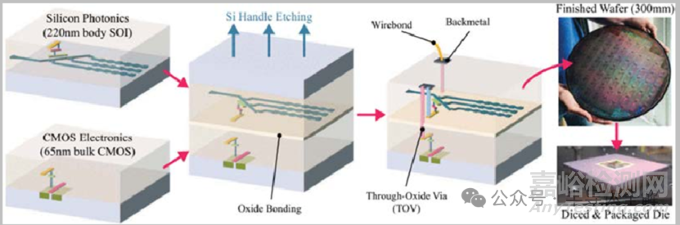下圖是一種三維集成的光學(xué)相控陣列,光學(xué)相控陣列的芯片分為兩個(gè)部分制備,光芯片在 220nm厚的 SOI 片上制備,電芯片在 65nm 厚的裸片上制備,然后經(jīng)過晶圓鍵合,實(shí)現(xiàn)兩者的集成,再經(jīng)過通孔工藝,實(shí)現(xiàn)電路芯片對(duì)光路芯片的控制,這種工藝方式可以將兩套完全不同的工藝分開制備,降低了單片集成的工藝復(fù)雜性,提高了制備效率,降低了工藝成本,這對(duì)產(chǎn)品的推向市場是有很大幫助的。
