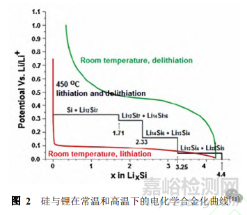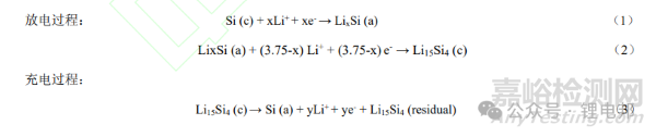 根據(jù)負(fù)極材料與鋰離子的結(jié)合形式,可將負(fù)極材料儲鋰機制分為嵌入型、合金型及轉(zhuǎn)化型三種,其中硅基負(fù)極為合金型儲鋰機制。晶體硅的首次鋰化經(jīng)歷著從結(jié)晶到非晶的相變轉(zhuǎn)換,并維持在非晶態(tài)。硅基負(fù)極的脫 嵌鋰過程分別對應(yīng)著去鋰硅合金化及生成鋰硅合金相(LixSi)的過程。其中在理想的高溫鋰化條件下,Li與Si合金化反應(yīng)會發(fā)生多相變轉(zhuǎn)化,分別形成Li12Si7、Li7Si3、Li13Si4、Li22Si5四種合金相,而在常溫條件下,只能檢測Li15Si4的存在,如圖 2 所示。圖 2 中硅的首次放電(嵌鋰)曲線呈現(xiàn)為一個較低的長平臺,其對應(yīng)為晶態(tài)硅變成無定形態(tài)的鋰硅合金。在放電電位降至0.05V以下時,會出現(xiàn)晶態(tài)的Li15Si4相,在充電時則部分轉(zhuǎn)化為無定形態(tài)。硅的充放電過程中反應(yīng)如下,通過不斷去鋰硅合金化及生成鋰硅合金的過程來實現(xiàn)鋰離子的可逆存儲,式中 c 表示結(jié)晶態(tài),a 表示無定形態(tài)。