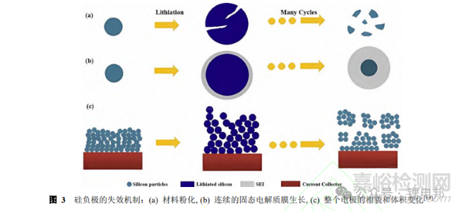 如圖 3a 所示,從單一硅原子角度來看,因為其脫嵌鋰過程不斷發(fā)生鋰-硅(Li-Si)合金化反應(yīng)導(dǎo)致體積反復(fù)變化,該過程中產(chǎn)生的機械應(yīng)力不斷破壞電極材料使其粉化,導(dǎo)致其長循環(huán)性能變差,致使電池電化學(xué)性能降低。另外如圖 3b 所示,從整個硅基電極角度看,合金化反應(yīng)的過程中,在鋰離子嵌入硅顆粒時硅基電極膨脹,導(dǎo)致在電極界面不斷發(fā)生電解質(zhì)與帶電活性顆粒(如硅、氧化硅、導(dǎo)電炭黑)接觸,從而導(dǎo)致 SEI 膜的不斷生長,破壞電極的導(dǎo)電網(wǎng)絡(luò),進而引起電池失效。最后如圖 3c 所示,硅基負(fù)極在不斷的合金化反應(yīng)中收縮膨脹,使得電極材料與集流體的粘結(jié)力逐漸減小,逐漸從集流體上脫落,最終造成負(fù)極失效。