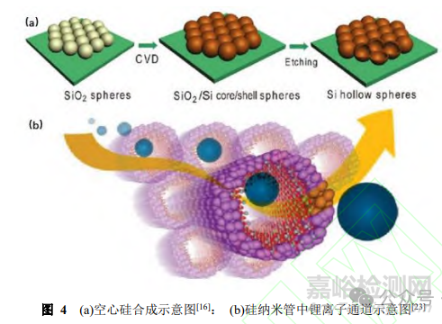 相較于 Si 納米線,Si 納米管因其獨特的中空結(jié)構(gòu)而備受關(guān)注,其更高的比表面積為材料性能的提升提供了可能。SongT 等通過在銅箔上構(gòu)建蜂窩狀硅納米管(圖 4b 所示),實現(xiàn)定向可控圖案的 Si-CNT 電極制作。這種蜂窩狀結(jié)構(gòu)有助于在早期循環(huán)中生成穩(wěn)定的 SEI 膜,對穩(wěn)定電極結(jié)構(gòu)及減少容量衰減起到重要作用。