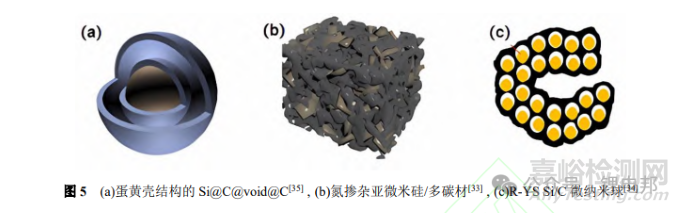 在 Si/C 復(fù)合核殼結(jié)構(gòu)基礎(chǔ)上,研究者們進一步提出了蛋黃-蛋殼結(jié)構(gòu),如圖 5a 所示。用 C 殼來包覆內(nèi)層的硅顆粒蛋黃,C 殼在促進鋰離子和電子傳輸?shù)耐瑫r還增大了比表面積。C 殼內(nèi)部空間設(shè)計使 Si 顆粒在充放電過程中可自由膨脹和收縮,有效避免了顆粒破碎問題。蛋黃-蛋殼結(jié)構(gòu)的制備通常包括三個步驟:合成模板,C層沉積以及模板去除,其中 SiO2 是常用模板材料之一。Ma 等人使用低成本瀝青作為碳?xì)で膀?qū)體和商品化硅納米顆粒作為硅蛋黃,成功設(shè)計和制備了一種新型覆盆子狀蛋黃殼結(jié)構(gòu)的(R-YS)Si/C微/納米球,如圖 5c 所示。測試表明,(R-YS)Si/C微/納米球在200mA/g時的可逆容量為1064 mAh/g,其內(nèi)部結(jié)構(gòu)調(diào)整使其在250次循環(huán)后仍具有981mAh/g的比容量,容量保持率高達92%。通過微觀結(jié)構(gòu)分析,發(fā)現(xiàn) R-YS-Si/C 微/納米球比普通YS-Si/C 納米球在結(jié)構(gòu)上更有優(yōu)勢,從而帶來更卓越的循環(huán)穩(wěn)定性。Zhu 等通過液體涂覆和原位聚合方法設(shè)計并成功合成了雙碳保護的硅電極。該電極表現(xiàn)出高比容量(1919mAh/g)、長期循環(huán)穩(wěn)定性(與第二次循環(huán)容量相比,400次循環(huán)后仍保持90%)和出色的倍率性能(2A/g時放電比容量達1170 mAh/g)。由此可見,新型雙碳層蛋黃-蛋殼結(jié)構(gòu)具有更好的容量和倍率性能。