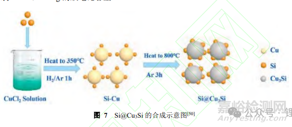 Zhang 等通過將納米 Si 顆粒浸泡在 CuCl2 溶液中,經(jīng)過加氫還原和煅燒處理,得到了 Si@Cu3Si 復(fù)合材料,如圖 7 所示。TEM 觀察顯示,Cu3Si 緊密的固定在 Si 粒子上,增強 Si 粒子的導(dǎo)電連接。該結(jié)構(gòu)在減緩電極體積膨脹的同時,減少了 Si 與電解液的接觸,進而抑制了 SEI 膜的生長。Ruttert 等以微米級 Fe 粉為前驅(qū)體,通過機械球磨法制備了具有不同活性的 FexSiy材料,通過形成穩(wěn)定的非活性緩沖相來提高 Si 電極的循環(huán)性能,該電極在1C倍率下的放電比容量為 1544.9mAh/g,120次循環(huán)后仍能保持1375mAh/g的放電比容量。