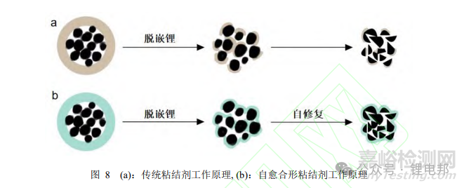 自愈合型粘結(jié)劑具有自動修復(fù)硅材料體積膨脹帶來的機械斷裂能力。這類粘結(jié)劑因其內(nèi)部存在的可逆相互作用,具有較強的自愈能力和機械性能,可修復(fù)體積變化造成的損傷,提高電極的可靠性和穩(wěn)定性,進而提高電池的電化學(xué)性能。