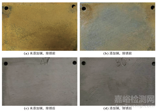 圖 4 除銹前后未添加和添加鑭試驗鋼腐蝕表面的宏觀形貌