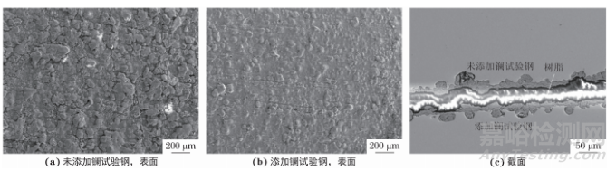 圖 5 不同試驗鋼腐蝕后表面和截面微觀形貌