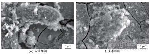 圖 7 未添加和添加鑭試驗鋼腐蝕產(chǎn)物的微觀形貌