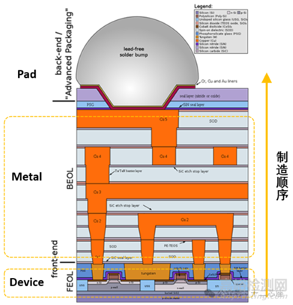 當(dāng)然,對于這么小的 MOS 管,無法使用直接焊接的方式,而是需要采用與FEOL相似的技術(shù),通過金屬布線在多達(dá)數(shù)十億個(gè) MOS 管之間形成連接。這一過程我們稱之為晶圓加工的后端工藝(BEOL,Back End Of the Line)。目前大多選用 Cu 作為導(dǎo)電金屬,因此后道又被稱為 Cu 互聯(lián)(interconnect)。