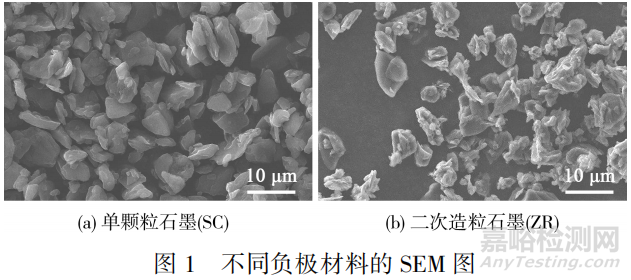 兩種不同人造石墨負(fù)極材料的SEM圖如圖1所示。從圖1可知,SC負(fù)極材料的形貌為常規(guī)的片層狀;經(jīng)過二次造粒工藝后的ZR負(fù)極材料不同于SC的片層狀形貌,呈現(xiàn)出由多個較小一次顆粒組成的橢球型顆粒形狀。
