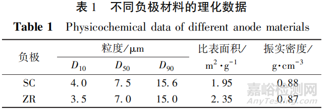 兩種負(fù)極材料的部分理化數(shù)據(jù)見表1。從表1可知,兩種功率型負(fù)極材料的粒徑都較小。與SC負(fù)極材料相比,由二次造粒工藝制備的ZR負(fù)極材料的粒徑分布更窄。粒徑更小的ZR負(fù)極材料的比表面積為2.35m2/g,高于SC負(fù)極材料的1.95m2/g。