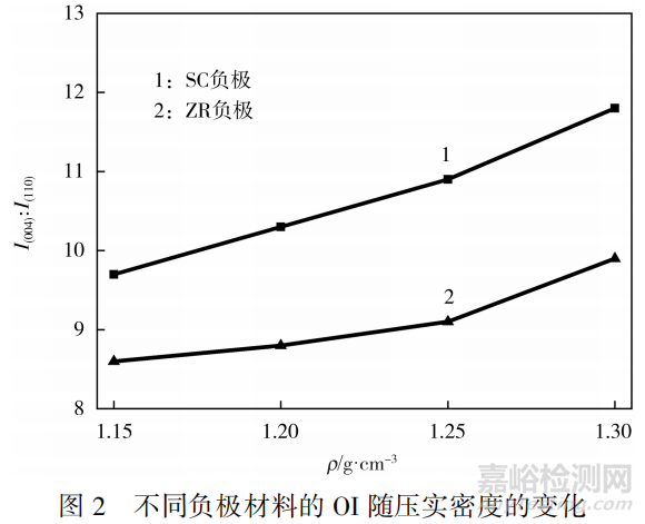 從圖2可知,在不同壓實(shí)密度下,SC負(fù)極材料的OI均高于ZR負(fù)極材料;隨著壓實(shí)密度增大,OI逐漸增長,各向同性變差。這表明,二次造粒負(fù)極材料的各向同性特征更好。