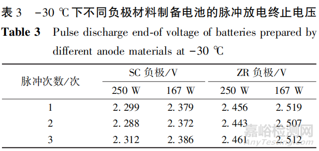 為進(jìn)一步評估負(fù)極材料對功率型電池低溫性能的影響,測試電池的低溫(-30℃ )脈沖放電性能,結(jié)果見表3。從表3可知,在-30℃時,相同脈沖條件下,第3次脈沖恒功率放電時,以250W和167W功率放電的ZR負(fù)極材料制備電池的終止電壓比SC負(fù)極材料制備的分別高0.149V和0.126V。這是因?yàn)閆R負(fù)極材料的阻抗更小,降低了低溫對動力學(xué)因素的影響。