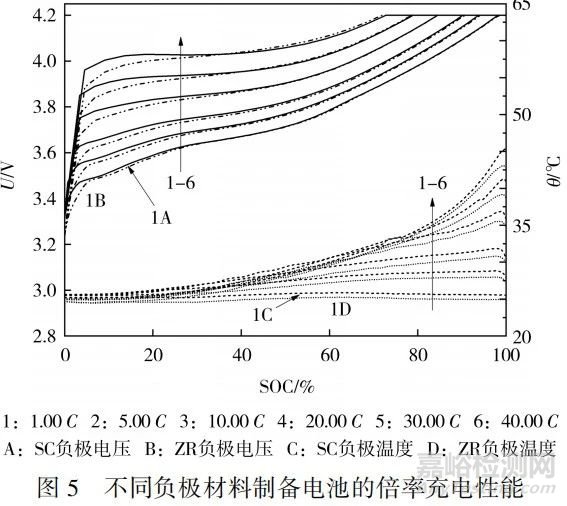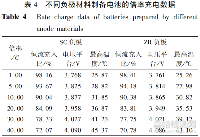 不同負(fù)極材料制備電池的倍率充電性能及溫升示意圖見圖5,詳細(xì)數(shù)據(jù)見表4。從圖5可知,電池在充電初期受極化作用的影響,極化作用越明顯,電壓上升越快。SC負(fù)極的阻抗比ZR負(fù)極更大,因此,帶來的極化影響更強(qiáng),曲線斜率更大。