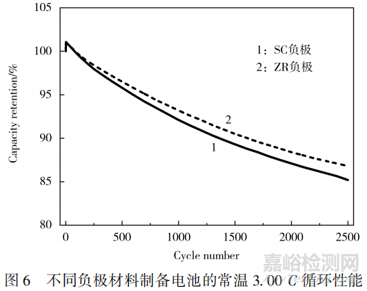 不同負(fù)極材料制備電池的常溫3.00C循環(huán)性能見圖6。從圖6可知,第2500次循環(huán)時,SC負(fù)極材料與ZR負(fù)極材料制備電池的容量保持率分別為85.2%和86.7%。ZR負(fù)極材料制備的電池由于阻抗較小,在3.00C電流條件下的電池極化更輕,循環(huán)性能略好。