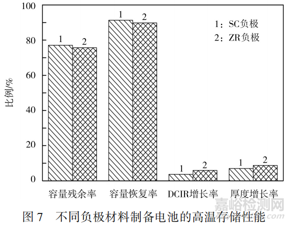 兩種負(fù)極材料制備電池在60℃存儲30d的性能見圖7。從圖7可知,60℃滿電存儲30d后,與ZR負(fù)極材料相比,SC負(fù)極材料制備電池的容量殘余率及容量恢復(fù)率分別高1.4%及1.5%,說明SC負(fù)極材料制備的電池存儲過程中因不可逆反應(yīng)損失的容量低于ZR負(fù)極材料。