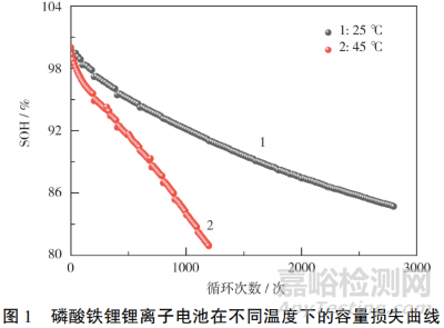 單體電池在25℃、45℃下進(jìn)行1.0C充放電測(cè)試,分析不同溫度下的老化情況,結(jié)果見(jiàn)圖1。從圖1可知,45℃下電池容量衰減速率明顯增大,循環(huán)1000次時(shí),SOH為83.8%,而25℃下仍有92.2%。SOH衰減至85%時(shí),45℃時(shí)的循環(huán)次數(shù)僅為25℃的1/3。