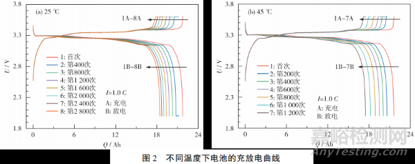 在25℃、45℃下,電池的充放電曲線見(jiàn)圖2。從圖2可知:隨著電池循環(huán)老化的深入,25℃下每400次循環(huán)的容量損失減少;而45℃下每200次循環(huán)的容量損失微小增長(zhǎng)。隨著循環(huán)次數(shù)的增加,充電電壓平臺(tái)拐點(diǎn)向低容量方向移動(dòng),放電電壓平臺(tái)降低,說(shuō)明電池內(nèi)阻增大,內(nèi)部極化增強(qiáng)。