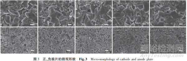 在25℃、45℃下,全電池循環(huán)老化到不同SOH時(shí),正、負(fù)極片的表面形貌見(jiàn)圖3。從圖3可知,相比新鮮電池,老化后的負(fù)極石墨材料表面出現(xiàn)白色的顆粒狀凸起,可能是材料表面的鋰鹽產(chǎn)生的結(jié)晶。在相近SOH下,45℃老化的電池老化的顆粒相比25℃老化的更多、尺寸更大,說(shuō)明高溫加速了電解液與負(fù)極的反應(yīng)速率,導(dǎo)致更多鋰鹽的生成。