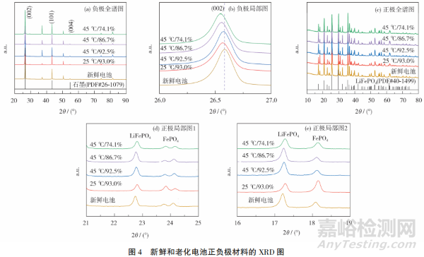 在正極的XRD全譜圖[圖4(c)]中觀察不到正極材料的整體結(jié)構(gòu)發(fā)生變化,峰位置與LiFePO4的標(biāo)準(zhǔn)譜(PDF#40-1499)相符。在理想狀態(tài)下,空電態(tài)Li+全部回到正極,重新形成磷酸鐵鋰,而磷酸鐵相的出現(xiàn)僅為化成階段消耗部分鋰造成。在局部圖中[圖4(d)、(e)],相比于新鮮和25℃老化的電池,45℃老化的正極中磷酸鐵鋰相的峰強(qiáng)度下降,而磷酸鐵相峰的強(qiáng)度相比新鮮電池增強(qiáng),說(shuō)明在循環(huán)過(guò)程中能嵌入磷酸鐵的Li+減少。此外,老化后的磷酸鐵鋰和磷酸鐵相沒(méi)有向低角度方向偏移,說(shuō)明結(jié)晶度未下降,仍保持良好的晶體結(jié)構(gòu)。