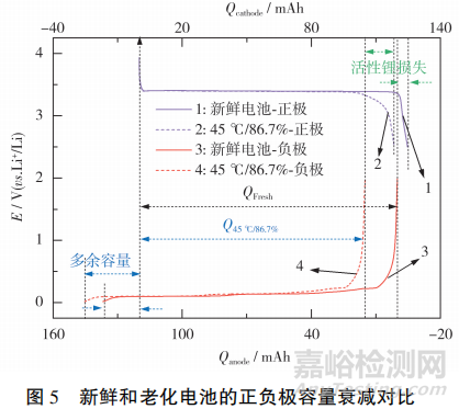 電池老化過(guò)程的正負(fù)極容量衰減對(duì)比見(jiàn)圖5。新鮮電池在化成過(guò)程中,會(huì)在負(fù)極表面生成SEI膜,造成活性鋰的不可逆損失。由于負(fù)極與正極的容量比大于1,會(huì)導(dǎo)致負(fù)極多余的容量無(wú)法利用,形成負(fù)極的多余容量,此時(shí),新鮮電池的可用容量為QFresh。
