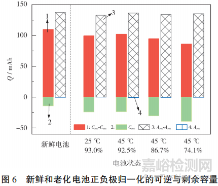 將老化電池的極片組裝成單片電池進(jìn)行測(cè)試,得到正極可逆容量(Crev)、正極剩余容量(Cres)、負(fù)極可逆容量(Arev)和負(fù)極剩余容量(Ares),見(jiàn)圖6。從圖6可知,在相近的SOH下,45℃老化電池的正極剩余容量、可用容量與25℃老化的基本相等。在45℃下,隨著SOH的降低,正極剩余容量增多,造成可用容量減少,而負(fù)極的剩余容量增加很少,且由于負(fù)極過(guò)量,負(fù)極的可用容量大于正極。