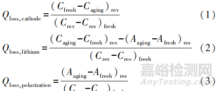 式(1)-(3)中:Qloss,cathode為正極衰減造成的容量損失;Qloss,lithium為活性鋰不可逆消耗造成的容量損失;Qloss,polarization為全電池極化造成的容量損失;Cfresh、Caging分別為新鮮電池正極、老化電池正極的容量;Aaging、Afresh分別為老化電池負(fù)極、新鮮電池負(fù)極的容量。