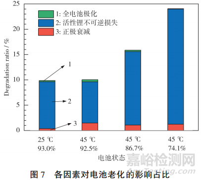 從圖7可知,活性鋰的不可逆損失對(duì)全電池的容量衰減起主導(dǎo)作用。這一損失主要是負(fù)極SEI膜的修復(fù)、生長(zhǎng)及表面鋰鹽消耗Li+所致。全電池的極化在整個(gè)老化過(guò)程中所占比例極小。相比25℃老化,45℃老化的正極衰減比例增大,是因?yàn)楦邷丶铀倭穗娊庖旱姆纸?,在正極表面生成正極固體電解質(zhì)相界面(CEI)膜,同時(shí),高溫有助于鐵離子的脫出,造成磷酸鐵鋰晶胞出現(xiàn)空穴,正極結(jié)構(gòu)衰退,最終導(dǎo)致正極容量衰減。在45℃下,隨著SOH的下降,活性鋰損失造成的容量衰減比例逐漸升高,說(shuō)明SOH的下降由活性鋰的損失造成;正極衰減的比例基本不變,說(shuō)明正極材料的衰減只與溫度有關(guān)。