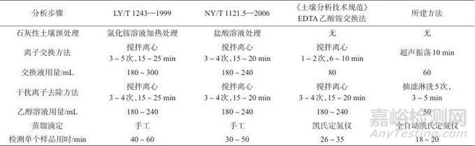 將所建方法與LY/T 1243—1999 《森林土壤陽(yáng)離子交換量的測(cè)定》、NY/T 1121.5—2006 《土壤檢測(cè) 第5部分:石灰性土壤陽(yáng)離子交換量的測(cè)定》、《土壤分析技術(shù)規(guī)范》EDTA乙酸銨交換法的分析步驟進(jìn)行對(duì)比,結(jié)果見表6。由表6可知,該方法在節(jié)省人力和試劑、操作的穩(wěn)定性方面效果突出,檢測(cè)效率更高。一臺(tái)超聲波清洗器可同時(shí)處理20個(gè)樣品,用真空泵的雙氣頭設(shè)計(jì),一臺(tái)真空泵可同時(shí)抽濾淋洗2個(gè)樣品,按儀器單臺(tái)套統(tǒng)計(jì),每人每小時(shí)可以預(yù)處理20個(gè)樣品,全自動(dòng)凱氏定氮儀每小時(shí)可以測(cè)定10個(gè)樣品。