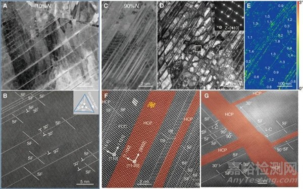 圖2 梯度位錯結(jié)構(gòu)(GDS)304不銹鋼σmax = 570 MPa循環(huán)蠕變過程中的結(jié)構(gòu)演變特征。(A, B) 10%Nf 時SEM (A) 和 HAADF-STEM (B) 結(jié)果表明諸多微米尺度變形帶(納米層錯)穿過多個位錯胞;(C, D) 90%Nf 時SEM (A) 和TEM (B) 結(jié)果表明更高密度變形帶穿過了位錯胞群,且位錯胞依然穩(wěn)定存在;(E) 取向分布圖顯示變形帶穿過的位錯胞群取向差均屬于小角范疇,與初始態(tài)相當;(F) HAADF-STEM結(jié)果表明微米尺度變形帶由超高密度的HCP-FCC 納米層片和層錯結(jié)構(gòu)組成;(G) 相互交割的HCP 納米層片、層錯和L-C 位錯鎖組成的更加細化的三維網(wǎng)絡(luò)結(jié)構(gòu)。
